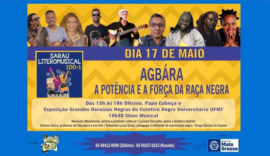 Agbára, expressão yorubá, é a palavra de ordem no evento da próxima quarta-feira (17), do 5º Sarau Literomusical 100+1, destaca a potência e a força da raça negra. A realização é da Academia Mato-Grossense de Letras e a Secretaria de Estado de Cultura, Esporte e Lazer