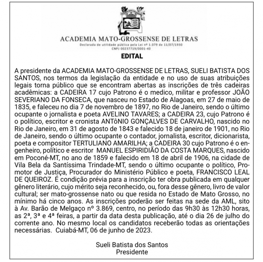 A oficina “Prestação de contas de projetos pelo Sistema de Gerenciamento de Convênios-SIGCon” será híbrida e gratuita, voltada para participantes do Edital de Seleção Pública– Estevão de Mendonça de Incentivo à Literatura Mato-Grossense e Organizações da Sociedade Civil. A realização é da Academia Mato-Grossense de Letras-AML em parceria com a Secretaria de Estado de Cultura, Esporte e Lazer-SecelMT.