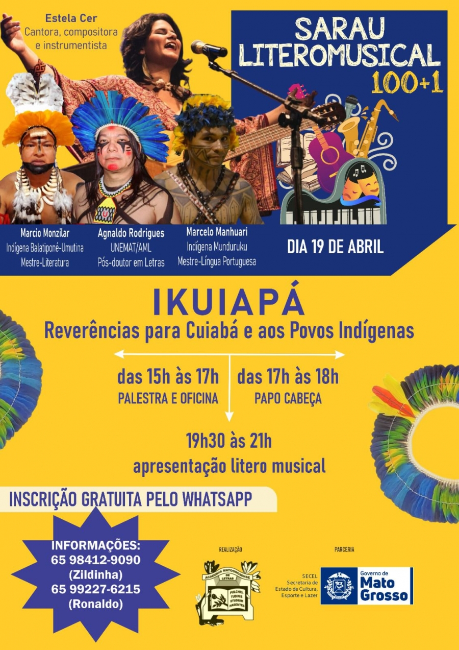 Ikuiapá é o nome do sarau que celebra os povos indígenas e Cuiabá, no próximo dia 19, uma realização da Academia Mato-grossense de Letras, em parceria com a Secretaria de Estado de Cultura, Esporte e Lazer (MT)