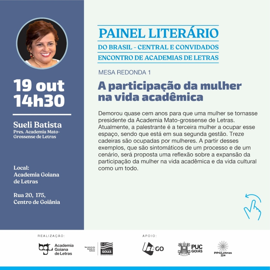 - Às 14h30min – a escritora Mary Sônia Valadares, presidente da Academia Tocantinense de Letras, enfocou O papel das academias na vida cultural das cidades novas.